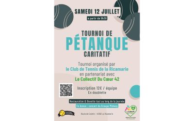 Notre 2ème tournoi de pétanque solidaire en doublette aura lieu le samedi 12 juillet à partir de 9h30 au stade Caintin de la Ricamarie. Cette année encore, c’est en partenariat avec le Tennis Club De La Ricamarie que nous remercions grandement pour leur soutien et leur confiance.